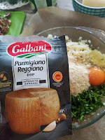 Към него прибавих яйцата, настърганите кашкавал и Пармежано Реджано, бадемовото брашно и магданоза. Подправих със самардала, сол и черен пипер на вкус.